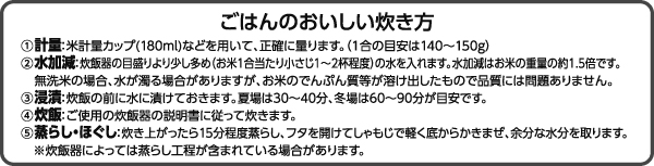 - 精米100g当たり エネルギー358kcal たんぱく質6.1g 脂質0.9g 炭水化物77.6g 糖質77.1g 食物繊維0.5g 食塩相当量0.0g この表示値は、目安です。