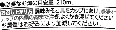 - 調味みそ[酒精、調味料(アミノ酸等)]、具[調味料(アミノ酸等)、豆腐用凝固剤]