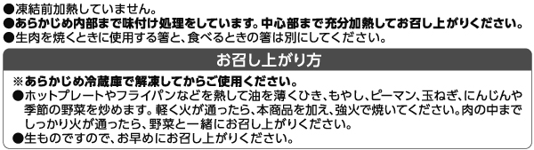 - 羊肉(オーストラリア産)、たれ[糖類(果糖ぶどう糖液糖、砂糖)、しょうゆ(大豆・小麦を含む)、果汁(りんご、オレンジ)、玉ねぎ、にんにく加工品、ソース(りんご・大豆を含む)、食塩、ワイン、にんにく、しょうが加工品、香辛料、酵母エキス(りんごを含む)、ポークエキス]、水あめ