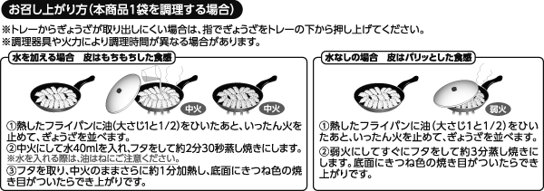 初めて購入しました。フライパンに蓋をして簡単に調理できます。ずっしりと餡がつまっており、型崩れせずに焼けます。 お味はいつも購入するチルド餃子とも羽付餃子とも異なり、やや肉餃子的な味わいに近い感じです。バリエーションとしてまた購入しても良いなと思いました。