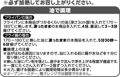 - スケソウダラ(ロシア産)、衣[パン粉(小麦を含む)、小麦粉、大豆油、食塩]