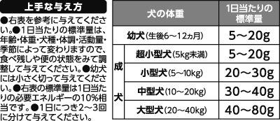 - ●ペットフードとしての用途をお守りください。●本商品は間食用です。主食として与えないでください。●生後6ヵ月未満の歯の生えそろわない幼犬には与えないでください。●上表の標準量を守り、与えすぎにご注意ください。●ペットが誤って飲み込まないよう、与え方やサイズに十分ご注意ください。●ペットがいたずらなどしないよう、保管場所にご注意ください。●お子さまの手の届かないところに保管してください。●この空き袋をお子さまのおもちゃにしないでください。口や鼻をふさいで窒息する恐れがあります。空き袋はすぐに廃棄してください。●開封後は袋の口をしっかり閉じて冷蔵庫(10℃以下)で保管し、早く与えてください。●冷蔵した場合は、室温に戻してから与えてください。