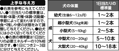 - ●ペットフードとしての用途をお守りください。●本商品は間食用です。主食として与えないでください。●生後6ヵ月未満の歯の生えそろわない幼犬には与えないでください。●上表の標準量を守り、与えすぎにご注意ください。●食べ方や習性によってはのどに詰まらせることがあります。必ず観察しながら与えてください。●ペットがいたずらなどしないよう、保管場所にご注意ください。●お子さまの手の届かないところに保管してください。●この空き袋をお子さまのおもちゃにしないでください。口や鼻をふさいで窒息する恐れがあります。空き袋はすぐに廃棄してください。●開封後は袋の口をしっかり閉じて冷蔵庫(10℃以下)で保管し、早く与えてください。●冷蔵した場合は、室温に戻してから与えてください。