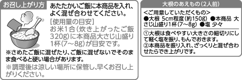 - 乾燥大根菜(大根菜(中国産)、ぶどう糖、食塩)、いり白ごま、乾燥わかめ、食塩、砂糖