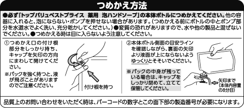 - 約3回分※1回分を本体内容量の約8分目と設定 トップバリュベストプライス 薬用 泡ハンドソープのボトルにつめかえてご使用ください。◆イソプロピルメチルフェノール(殺菌・消毒成分)配合◆ヒアルロン酸Na(保湿成分)配合◆弱酸性