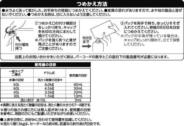 - 本商品はつめかえ用のみの販売です。お手持ちの容器につめかえてお使いください。これは飲み物ではありません。このパッケージの表示をよく読んでお使いください。ごみの分別は自治体の区分にしたがってください。包材にはバイオマス由来の成分を含むインキを一部使用しています。印刷インキ中の芳香族系有機溶剤の量が1%未満です。トルエン、キシレンを添加していません。