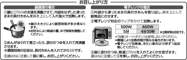 - めん[加工でん粉]、具[調味料(アミノ酸等)、安定剤(加工でん粉)、焼成カルシウム]、つゆ[調味料(アミノ酸等)、着色料(カラメル)、甘味料(アセスルファムK、スクラロース)、酸味料]