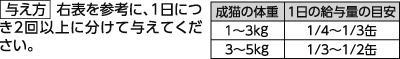 - 缶を開ける際は、缶切りが必要です。一般食 総合栄養食と一緒に与えてください。●開缶後は必ず容器に移し替えて冷蔵庫(10℃以下)で保管し、早く与えてください。与える際は、室温に戻してから与えてください。※色合いに多少のばらつきがありますが品質には問題ありません。※魚の骨が入っていることがあります。●賞味期限は、未開缶の状態で、表示されている方法で保存したときに品質が保たれる期限です。