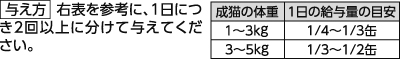 - 缶を開ける際は、缶切りが必要です。一般食 総合栄養食と一緒に与えてください。●開缶後は必ず容器に移し替えて冷蔵庫(10℃以下)で保管し、早く与えてください。与える際は、室温に戻してから与えてください。※色合いに多少のばらつきがありますが品質には問題ありません。※魚の骨が入っていることがあります。●賞味期限は、未開缶の状態で、表示されている方法で保存したときに品質が保たれる期限です。
