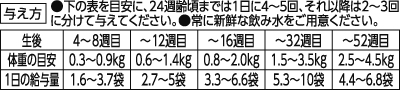 - 1袋(60g)当たり たんぱく質7.0%以上 脂質1.0%以上 粗繊維0.5%以下 灰分3.0%以下 水分90.0%以下 エネルギー42kcal【灰分主成分】リン0.05%以上 カリウム0.05%以上 マグネシウム(標準値)0.01%