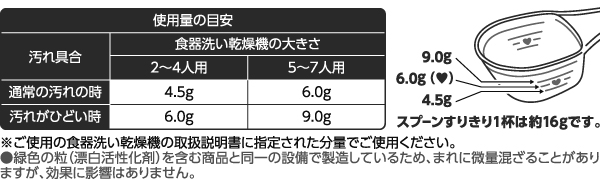 - *1:すべての菌を除菌するわけではありません。*2:すべてのにおいを消臭するわけではありません。●使用後はチャックをしっかり閉じ、立てて保管してください。スプーンが粉の中に埋もれていることがあります。※標準コースでも使用できます。これは食べ物ではありません。食器洗い乾燥機の取扱説明書と、このパッケージの表示をよくお読みください。ごみの分別は自治体の区分にしたがってください。包材にはバイオマス由来の成分を含むインキを一部使用しています。誤食に注意