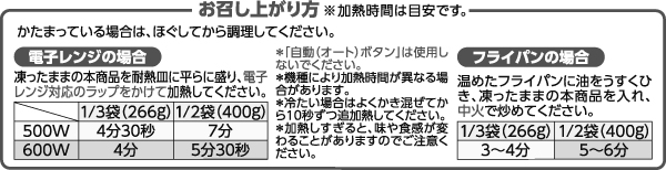 - 精白米(国産)、玉ねぎ(国産)、鶏肉(国産)、しょうゆ(小麦・大豆を含む)、食塩、ラード(豚肉を含む)、フライドガーリック、おろしにんにく、ショートニング、パーム油、スープストック(鶏肉・豚肉を含む)、ガーリックパウダー(大豆を含む)、こしょう、ビーフエキス