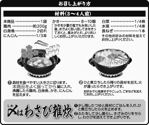 - 果糖ぶどう糖液糖(国内製造)、しょうゆ(小麦・大豆を含む)(国内製造)、食塩、たん白加水分解物(大豆を含む)、焼きあごだし、煮干しエキス、魚醤(魚介類)、焼きあごエキス、鶏ガラスープ、昆布エキス、かつお節粉末、そうだがつお節粉末