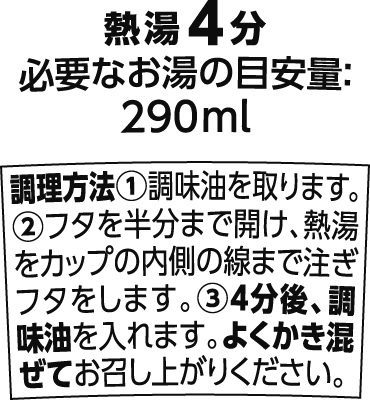 - 1食(72g)当たり エネルギー280kcal たんぱく質7.1g 脂質7.8g 炭水化物46.3g 糖質44.4g 食物繊維1.9g 食塩相当量5.5g めん・かやく1.7g スープ3.8g カルシウム174mg ビタミンB1 0.18mg ビタミンB2 0.23mg