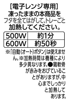 - 鶏軟骨、大豆油、小麦粉、とうもろこしでん粉、ばれいしょでん粉、パン粉(小麦を含む)、食塩、香辛料、クラッカー(小麦・大豆を含む)、ぶどう糖、砂糖、脱脂粉乳、大豆粉末