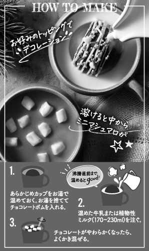 - ミルクチョコレート[砂糖、ココアバター、全粉乳、カカオマス、ホエイパウダー(乳成分を含む)、乳糖]、マシュマロ(タピオカシロップ、砂糖、タピオカでん粉、大豆たん白)