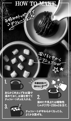 - チョコレート[カカオマス、砂糖、カカオバター、クリーム(乳成分を含む)]、マシュマロ(タピオカシロップ、砂糖、タピオカでん粉、大豆たん白)
