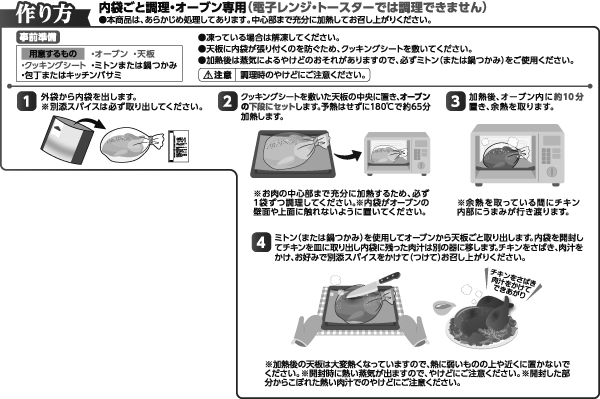 その手軽さと美味しさに大変満足しています。まず、調理法に驚きました。内袋のビニール袋のままオーブンに入れるというものだったので、破れないか、ちゃんと火が通るか不安でしたが、結果は全くの杞憂でした。袋の中で肉汁を逃さずきれいに焼けており、さらに皮には香ばしい焦げ目までしっかりついていたのです。これにより、手を汚さず、誰でも失敗なく本格的なローストチキンを作れるという点で、調理の手間が大きく軽減されました。 焼き上がり後、切り分けも比較的簡単に行うことができ、食卓で綺麗に食べ切ることができました。「味付き」と謳われているだけあって、しっかりと味が浸透しており、ジューシーで食べ応えがあります。特に、ローストチキンでパサつきがちな部分も、袋に残った豊富な肉汁をかけながら食べ進めることができたため、最後まで満足感が高かったです。また、付属のスパイスを使って途中で味変を楽しむことができたのも嬉しいポイントでした。最後まで飽きずに、本格的なローストチキンを堪能でき、買って良かったと感じています。