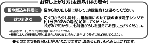 - 牛すじ串(牛すじ(中国産))、だし[食塩、還元水あめ、ぶどう糖果糖液糖、しょうゆ(小麦・大豆を含む)、植物たん白加水分解物(大豆を含む)、かつお節エキス、かつお節、昆布、チキンエキス、ポークエキス、いわし削り節、かつお節粉末、酵母エキス]
