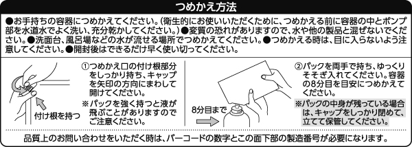 - 本商品はつめかえ用のみ販売しています。お手持ちの容器につめかえてお使いください。これは飲み物ではありません。お子さまや認知症の方などの誤飲を防ぐため、置き場所にご注意ください。ごみの分別は自治体の区分にしたがってください。袋にはバイオマス由来の成分を含むインキを使用しています。