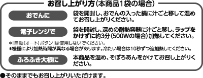 - 大根(インドネシア産)、だし[食塩、還元水あめ、ぶどう糖果糖液糖、しょうゆ(小麦・大豆を含む)、植物たん白加水分解物(大豆を含む)、かつお節エキス、かつお節、昆布、チキンエキス、ポークエキス、いわし削り節、かつお節粉末、酵母エキス]