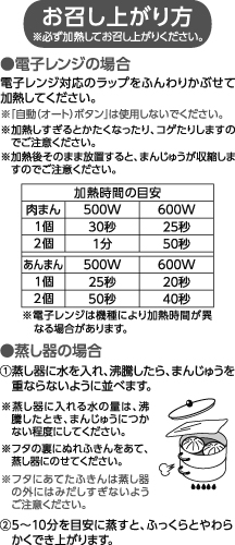 - 〈肉まん〉豚フィリング(国内製造)[たけのこ水煮、豚肉、植物性たん白、砂糖、パン粉、粉あめ、しょうゆ、エキス調味料、おろしにんにく、植物油脂、しょうが、乾燥玉ねぎ、食塩、シーズニングオイル、卵白粉、こしょう]、小麦粉、砂糖、牛乳、ラード、ぶどう糖、パン酵母、発酵種、食塩、乳等を主要原料とする食品、大豆粉、(一部に卵・乳成分・小麦・ごま・大豆・豚肉・ゼラチンを含む)〈あんまん〉粒あん(国内製造)[砂糖、小豆、水あめ、植物油脂、食塩]、小麦粉、砂糖、牛乳、ラード、ぶどう糖、パン酵母、発酵種、食塩、乳等を主要原料とする食品、大豆粉、(一部に乳成分・小麦・大豆を含む)