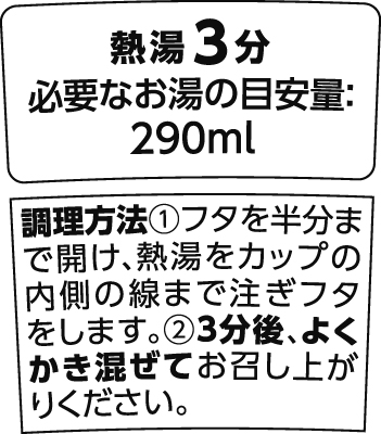 - 1食(82g)当たり エネルギー374kcal たんぱく質8.1g 脂質17.0g 炭水化物48.9g 糖質45.5g 食物繊維3.4g 食塩相当量4.9g めん・かやく2.7g スープ2.2g カルシウム118mg ビタミンB1 0.63mg ビタミンB2 0.39mg