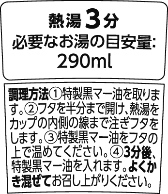 - 油揚げめん[小麦粉(国内製造)、植物油脂、食塩]、スープ[ポーク調味料(乳成分・大豆・鶏肉・ゼラチンを含む)、豚脂、でん粉、小麦粉、ガーリック調味料(小麦・大豆を含む)、クリーミングパウダー(乳成分を含む)、粉末しょうゆ(小麦・大豆を含む)、砂糖、チキン調味料(小麦・豚肉を含む)、食塩、麦芽糖、香辛料、酵母エキス(小麦を含む)、みそ調味料(小麦・大豆・豚肉を含む)]、かやく[大豆たん白加工品(卵・乳成分・小麦を含む)、ねぎ]、添付調味料[ガーリック調味油、植物油脂、香味油(小麦・ごま・大豆・豚肉を含む)]