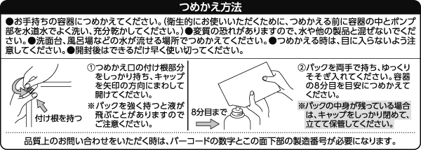 - 本商品はつめかえ用のみ販売しています。お手持ちの容器につめかえてお使いください。これは飲み物ではありません。お子さまや認知症の方などの誤飲を防ぐため、置き場所にご注意ください。ごみの分別は自治体の区分にしたがってください。袋にはバイオマス由来の成分を含むインキを使用しています。