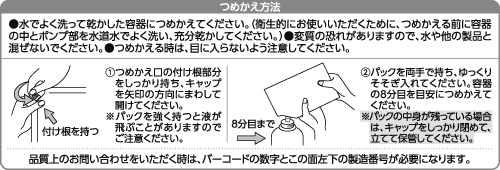 - 本商品はつめかえ用のみ販売しています。お手持ちの容器につめかえてお使いください。これは飲み物ではありません。お子さまや認知症の方などの誤飲を防ぐため、置き場所にご注意ください。ごみの分別は自治体の区分にしたがってください。袋にはバイオマス由来の成分を含むインキを使用しています。