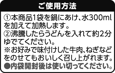 - うすくちしょうゆ(小麦・大豆を含む)(国内製造)、発酵調味液、砂糖、豚脂、食塩、たん白加水分解物(大豆を含む)、ビーフオイル、こんぶエキス、魚介エキス(さばを含む)、かつお節エキス、風味調味料(煮干しいわし)(乳成分を含む)、かつお節調味料、さば節粉末