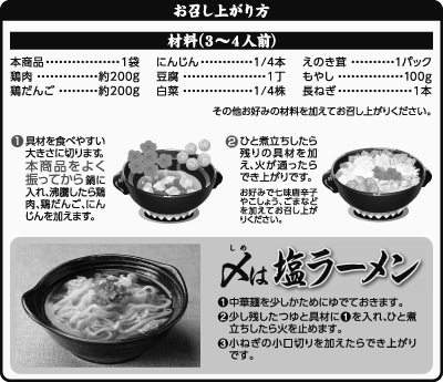 - 食塩(国内製造)、ごま油、チキンエキスパウダー、果糖ぶどう糖液糖、黒こしょう、チキンコンソメパウダー(小麦・ごま・大豆・豚肉を含む)、にんにくパウダー