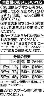 - コーヒー(粉)(12g)当たり エネルギー40kcal たんぱく質1.5g 脂質1.7g 炭水化物7.8g 糖質1.6g 食物繊維6.2g 食塩相当量0.0g 抽出液(160ml)当たり* エネルギー5kcal たんぱく質0.3g 脂質0g 炭水化物1.1g 糖質0.8g 食物繊維0.3g 食塩相当量0.0g この表示値は、目安です。*コーヒー1杯分