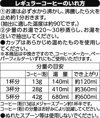 - コーヒー(粉)(13g)当たり エネルギー41kcal たんぱく質2.4g 脂質1.4g 炭水化物8.1g 糖質1.4g 食物繊維6.7g 食塩相当量0.0g 抽出液(120ml)当たり* エネルギー5kcal たんぱく質0.4g 脂質0g 炭水化物0.8g 糖質0.7g 食物繊維0.1g 食塩相当量0.0g この表示値は、目安です。*コーヒー1杯分