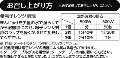 - 小麦粉(国内製造)、砂糖、生あん(小豆)、水あめ、ラード、ねりごま、イースト、植物油脂(ごまを含む)、コーンスターチ、食塩、白きくらげ抽出物、小豆、寒天、麦麹粉末(小麦を含む)