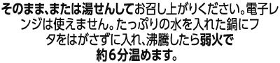 - ●「卵、小麦、かに、大豆」の成分を含んだ原材料を使用しています。●同じ生産工程で「乳、えび、牛肉、さば、鶏肉、豚肉」を含んだ食品を扱っています。