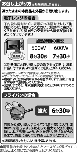 - めん[スパゲッティ(デュラム小麦のセモリナ)(イタリア製造)]、野菜(玉ねぎ(中国産)、ピーマン、にんじん)、トマトケチャップ、トマトペースト、なたね油、ソーセージ(豚肉・大豆・牛肉を含む)、オニオンペースト、砂糖、ウスターソース(りんごを含む)、食塩、豚脂、マーガリン(乳成分を含む)、ローストオニオンオイル(大豆・小麦を含む)、にんにくペースト、チキンシーズニングパウダー(乳成分・牛肉・豚肉・鶏肉・ゼラチン・大豆を含む)、香味油(小麦・大豆を含む)、白こしょう
