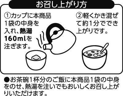 - しょうゆ(大豆・小麦を含む)、デキストリン、食塩、砂糖、チキンブイヨン粉末(小麦・乳成分・大豆・鶏肉を含む)、野菜ブイヨン粉末、白こしょう、うきみ・具[鶏卵(国産)、ほうれん草、ベーコン(豚肉・大豆・卵を含む)]