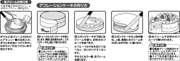 - 小麦粉(国内製造)、砂糖、卵、水あめ、卵白(卵を含む)、なたね油、乳化油脂(乳成分を含む)、生クリーム(乳成分を含む)、大豆粉、食塩、油脂加工品(乳成分を含む)、乳等を主要原料とする食品