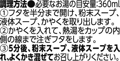 - 1食(86g)当たり エネルギー292kcal たんぱく質7.7g 脂質5.5g 炭水化物54.2g(糖質51.6g 食物繊維2.6g)食塩相当量6.2g(めん・かやく1.7g スープ4.5g)カルシウム131mg ビタミンB1 0.80mg ビタミンB2 0.20mg