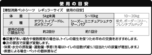 - ●フィルム面(ツルツルした面)を下にしてペット用トレーの中に敷いてお使いください。●ペットがトレーのまわりを汚してしまうことがあるので、汚れてもかまわない場所に置いてください。●ペットが使用したら、吸収した尿量や生活環境に応じて新しいシーツに取り替えてください。〈シーツの広げ方〉折りたたんであるシーツを床に置き、置いたままシーツを丁寧に両手で端まで広げてください。〈誤った広げ方〉シーツを持ったまま振り広げないでください。吸収体がかたより、モレの原因になったり、シーツが破れて中身が飛び散ることがあります。