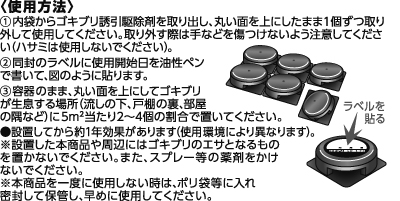 - ●置いたその日から効果があらわれるフィプロニルを配合し、誘引駆除剤を食べたゴキブリを駆除します。●誘引駆除剤を食べたゴキブリの成虫と、その成虫が持つ卵にも効果があります。●誘引駆除剤を食べて巣に帰ったゴキブリの、フンや死骸を食べたゴキブリにも効果があるので、巣ごと駆除します。