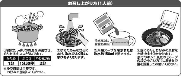 - めん[小麦粉(国内製造)、でん粉、食塩/加工でん粉、酒精、(一部に小麦を含む)]、冷麺スープ[しょうゆ、食塩、発酵調味料、醸造酢、糖みつ、ビーフエキス、みりん、砂糖、チキンエキス調味料、野菜エキスパウダー/調味料(アミノ酸等)、増粘剤(加工でん粉、グァー)、甘味料(アセスルファムK、スクラロース)、酸味料、(一部に乳成分・小麦・牛肉・ごま・大豆・鶏肉・豚肉を含む)]、キムチ風たれ[糖みつ、醸造酢、食塩、砂糖、唐辛子、キムチベース/増粘剤(加工でん粉)、酒精、調味料(アミノ酸等)、酸味料、香辛料抽出物、V.B1、パプリカ色素、(一部にさけ・大豆・りんご・魚醤(魚介類)を含む)]
