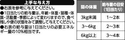 - ●ペットフードとしての用途をお守りください。●本商品は間食用です。主食として与えないでください。●生後6ヵ月未満の幼猫には与えないでください。●上表の給与量を守り、与えすぎにご注意ください。●与え方に十分ご注意ください。●ペットがいたずらなどしないよう、保管場所にご注意ください。●お子さまの手の届かないところに保管してください。●この空き袋をお子さまのおもちゃにしないでください。口や鼻をふさいで窒息する恐れがあります。空き袋はすぐに廃棄してください。●個包装開封後は早く与えてください。