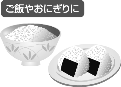 - 調味顆粒(国内製造)[乳糖、砂糖、鶏卵、食塩、酵母エキス、たん白加水分解物、かつお節粉末、かつお骨粉末]、味付ごま[いりごま、すりごま、砂糖、しょうゆ(小麦・大豆を含む)、食塩、酵母エキス、たん白加水分解物(大豆を含む)]、いりごま、のり、味付ごま[いりごま、砂糖、食塩、あおさ、酵母エキス、たん白加水分解物、青のり]、調味顆粒[乳糖、食塩、砂糖、あおさ、かつお節エキス粉末、たん白加水分解物、抹茶、昆布粉末]、味付宗田かつお削り節(小麦・大豆を含む)、味付卵そぼろ(卵・小麦を含む)、調味顆粒[乳糖、砂糖、食塩、かつお節粉末、しょうゆ(小麦・大豆を含む)、酵母エキス、たん白加水分解物、かつお骨粉末]