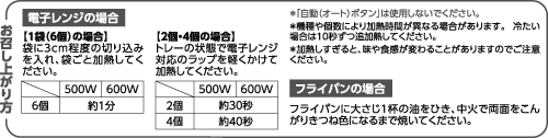 - 皮(でん粉(小麦を含む)、マルトデキストリン、ラード、ぶどう糖、ショートニング、食塩、砂糖、粉末油脂、こんにゃく粉)、野菜(にら(中国産)、キャベツ、玉ねぎ)、食肉(鶏肉、豚肉)、豚脂肪、粒状植物性たん白(大豆を含む)、しょうゆ(大豆・小麦を含む)、卵白液(卵を含む)、おろししょうが、おろしにんにく、植物油(ごまを含む)、オイスターソース、砂糖、パン粉(小麦・乳成分・大豆を含む)、中華調味料(鶏肉・大豆・小麦を含む)、ゼラチン、食塩、粉末状植物性たん白(小麦を含む)、酒、ポークエキス、酵母エキス、香辛料、脱脂粉乳、寒天