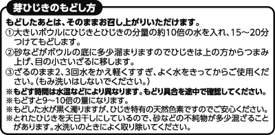 ヒジキの煮物を作る時はこの大きさのまま水で戻して使い、味噌汁などの汁ものに入れる時や卵焼きに入れる時は袋の上から麺棒をゴロゴロと回してヒジキを小さくして使っています。癖も匂いも無いので食べやすくて量もちょうど良いです。