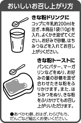 個包装のきな粉って大変使いやすいのに 珍しい存在だと思います。 とっても使いやすく、特に保存の面で大助かり。 甘酒に入れたり、 夏は小豆の粒が入ったかき氷や冷やし汁粉のトッピングにするのが好きです。