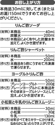 - りんご(イタリア産)、りんご酢、果糖ぶどう糖液糖、はちみつ、りんご抽出物