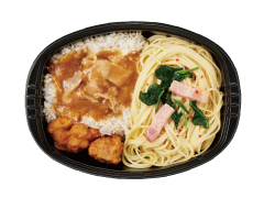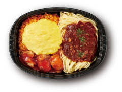 オムライスとボロネーゼパスタにグリルチキンものせた満足のワントレー。